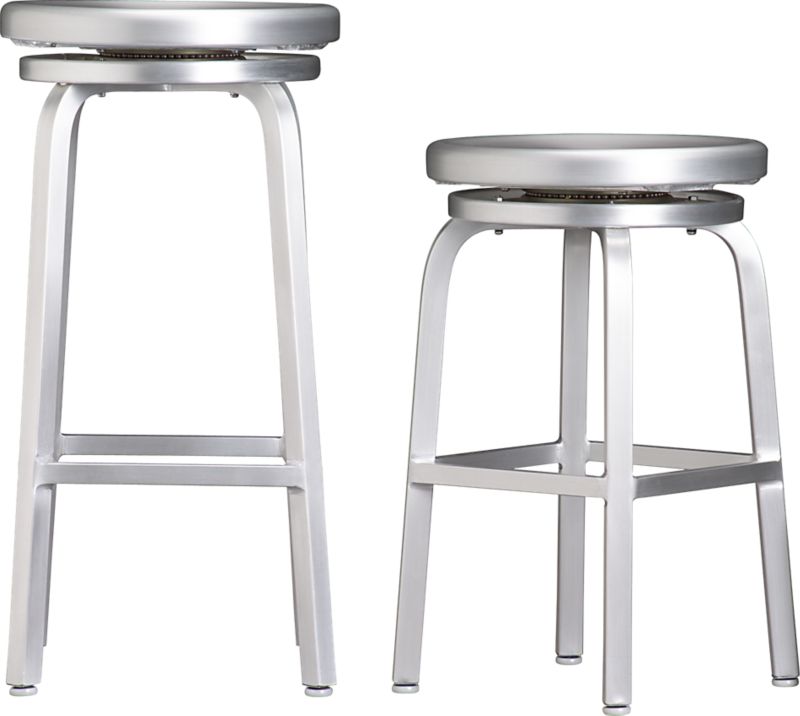 Super Stool:   Need seating at the kitchen breakfast bar?  In the craft/sewing room?  How about in the workroom/garage?  Crate & Barrel’s Spin Barstools to the rescue!  Not only good looking, but hardworking in a sharp brushed aluminum finish.  The ball-bearings under the seat give you a smooth 360-degree spin at either 24” ($99.95) or 30” ($109) high.
